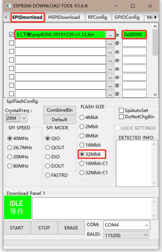 打开在乐鑫官网下载的烧录工具,点击ESP8266,按下图填写: