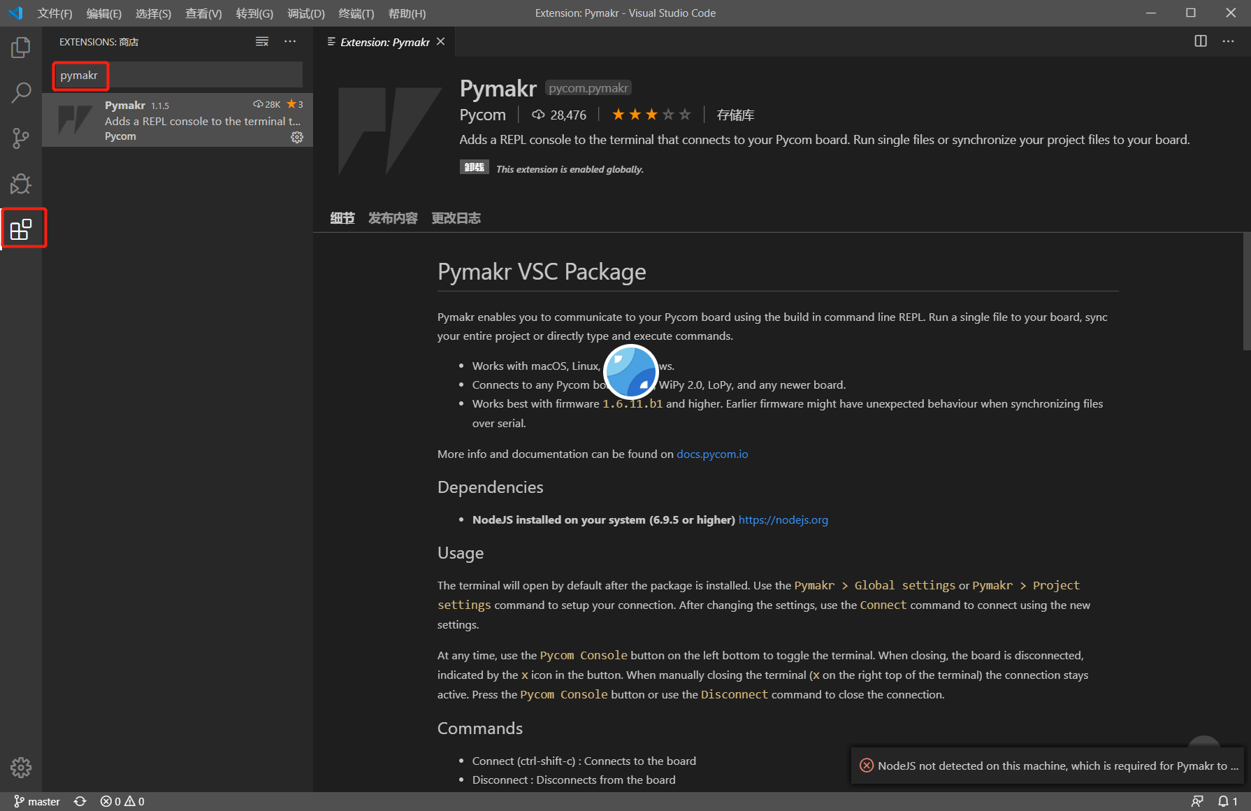 安装完,编辑器的右下角可能会提示没有NodeJS环境,前往官网下载安装。